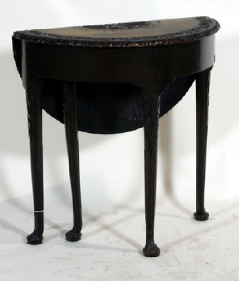 the top with rear drop leaf, with gate action forming a circular top, above a moulded frieze on turned legs ending in pad feet, the whole profusely carved with rosettes, lunettes and acanthus