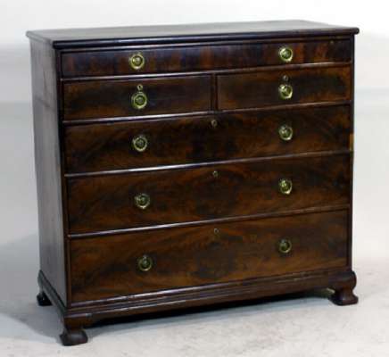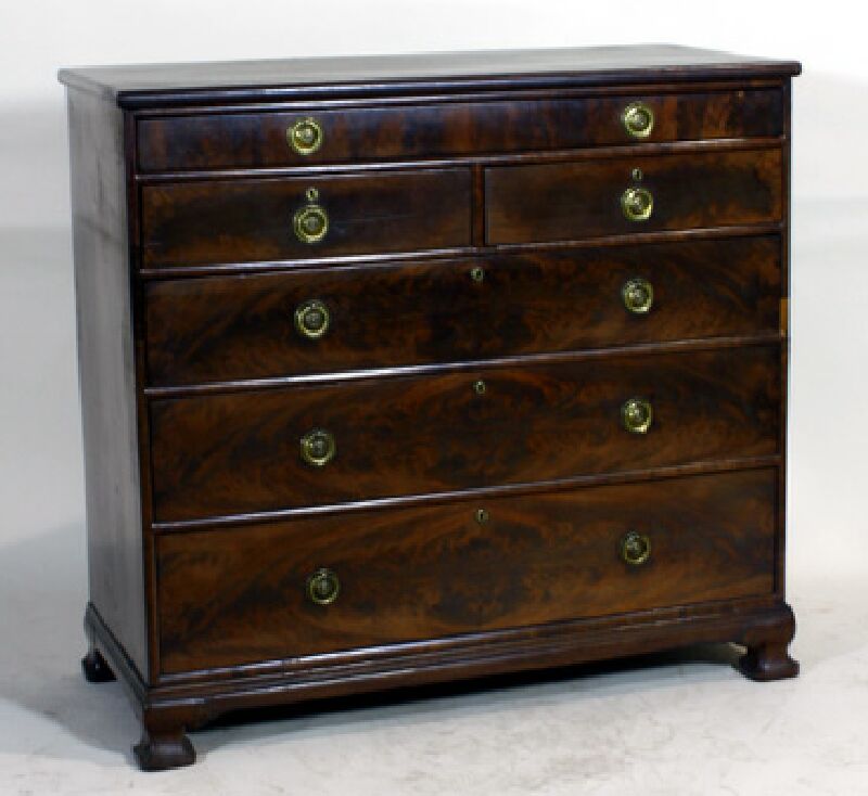 the shallow frieze drawer above a pair of short drawers and three further long drawers with brass ring handles, on foliate carved ogee bracket feet