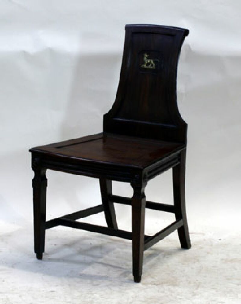the overscrolled and waisted back with sunken panel enslosing a gilt figure of a stylised animal, the moulded seat with beaded rail on square tapering legs headed by roundels, on ball feet