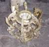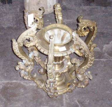 the leaf cast cresting above leaf knopped and fluted column with six finely chased acanthus scroll branches above a leaf cast ring supporting eight acanthus scroll branches with leaf cast sconces, on a gadrooned leaf scroll knop pendant