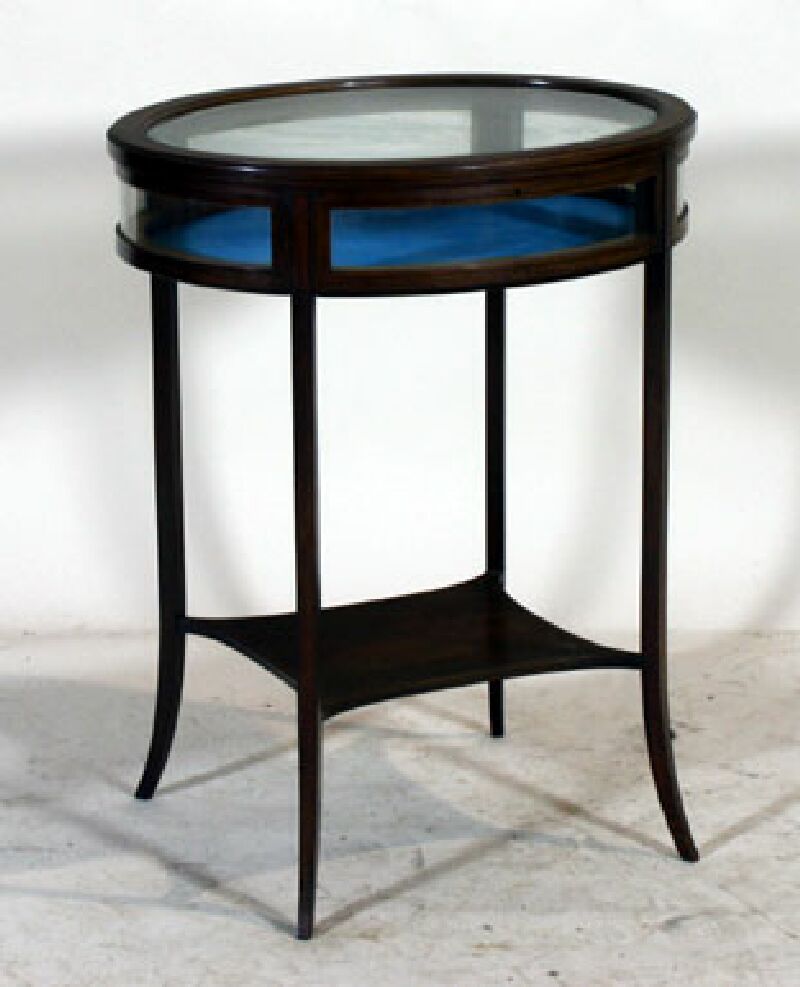 of oval form with hinged cover glazed sides, on splayed square section legs united by an undershelf