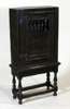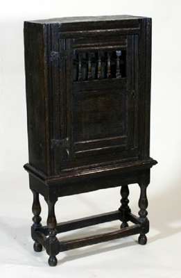 of small proportions, the panelled door with spindle filled upper portion and iron 'butterfly' hinges between channel moulded uprights, the stand with moulded edge, on four short baluster legs united by stretchers, on turned feet