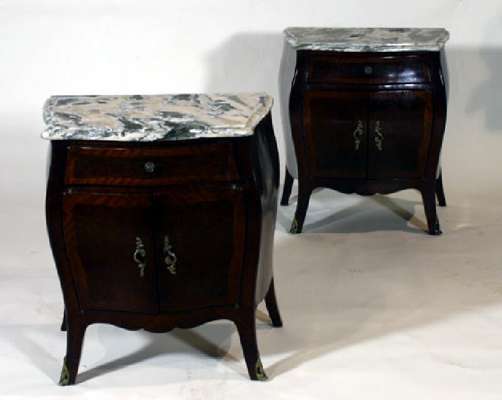 A pair of Louis XVth style walnut and burr thuya-wood bombe commodes
