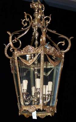 of tapering octagonal design with leaf scroll brackets above bevelled panes headed by swags and scallop shell crestings enclosing a rococo style six light fitting