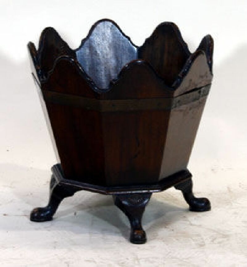 the moulded arched rim over tapering trunk raised on squat cabriole legs with pad feet