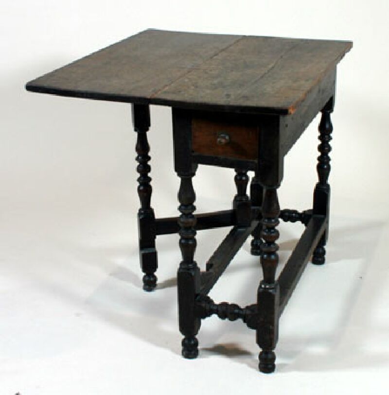 the rectangular top over single short drawer raised on baluster turned legs united by stretchers on pad feet