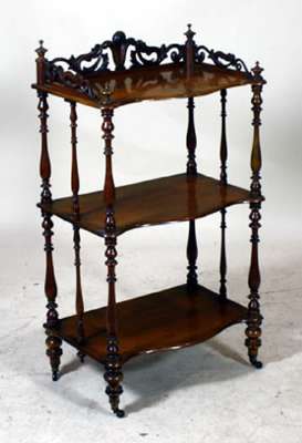 the pierced foliate carved three quarter gallery with urn finials over three serpentine open shelves rased on baluster turned supports, with brass caps and castors