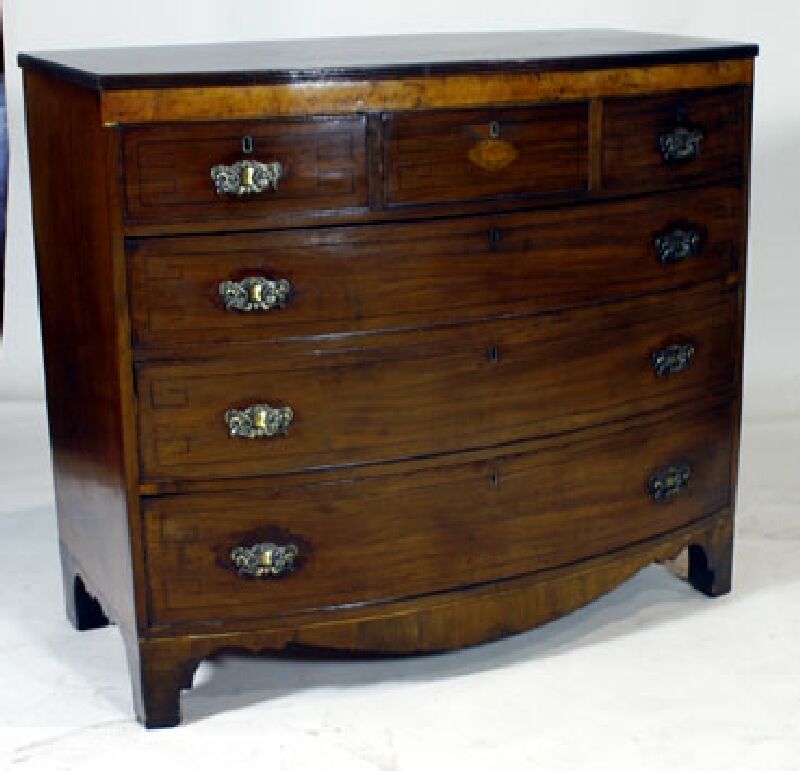 the reeded top over three cock-beaded short drawers over three graduated long drawers with serpentine apron,on raised bracket feet