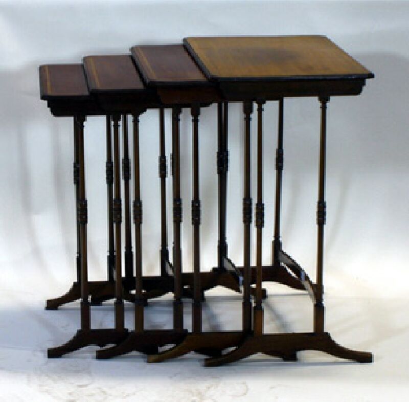 each with inlaid moulded rectangular top and canted corners, on ring turned supports, raised on squat sabre legs