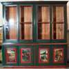 the projected moulded cornice over four glazed doors inclosing adjustable shelves above four cupboard doors each depicting country scenes raised on plinth base.