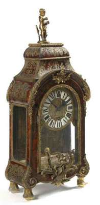 the cartouche shaped case with putto surmount and glazed door enclosing a giltmetal floral chased dial with raised enamel Roman chapters, the verge escapement striking the hours and half hours on a nest of three graduated bells, with pull-cord repeat, the backplate engraved with maker's signature, on foliate cast feet, the whole decorated with arabesques and acanthus scroll mounts