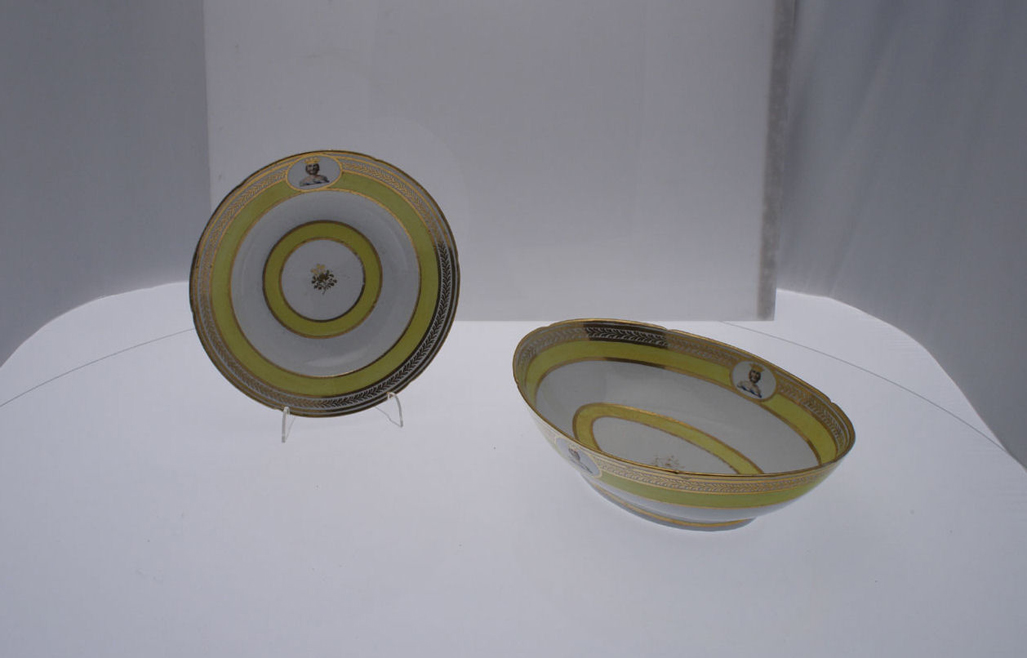 comprising: thirty two plates, twelve bowls, three oval dishes, and three circular dishes, each with yellow and gilt border, with armorial cartouche of a crowned bearded man (50)