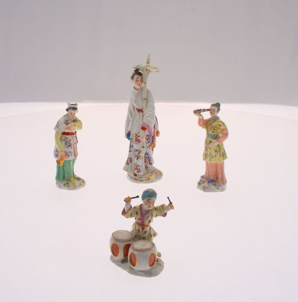 comprising: an oriental lady with parasol, 18cm high; an oriental man with telescope, 12cm high; an oriental drummer with two drums, 7cm high; and an oriental woman with bell, 12cm high, each with impressed marks and blue cross sword marks (4)