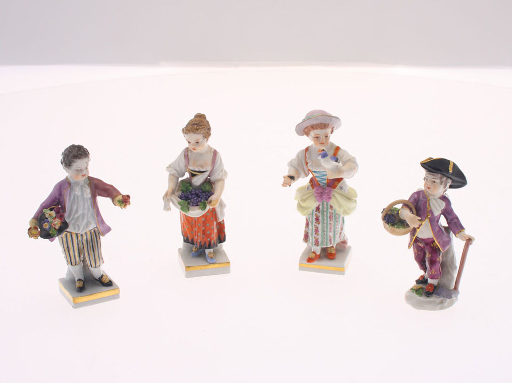 comprising: a child with bird, 10cm high, a putti with triform hat and grapes, 8.5cm high; a young woman with grapes, 9.5cm high; and a boy with hat and flowers, 9.5cm high, each with blue crossed sword marks and impressed marks (4)