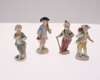 comprising: a young man with a basket of grapes, 12.5cm high; a man with triform hat and basket of flowers, 13cm high; an oriental figure with yellow cloak, 12.5cm high, each with blue crossed sword marks and impressed marks; and a Meissen style porcelain figure of a boy with green striped clothes and spade, 13cm high (4)