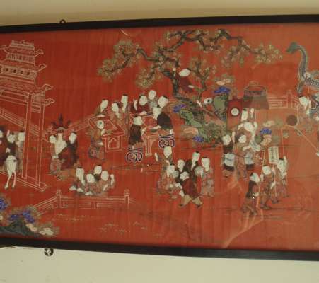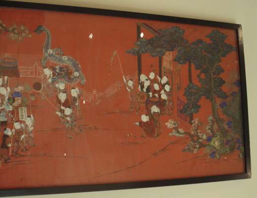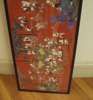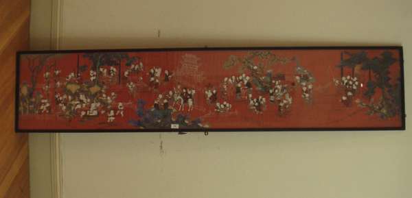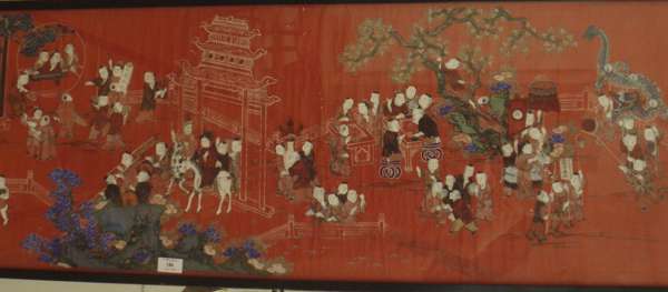 on red ground, with scenes of figures drinking and gambling, in black glazed frame