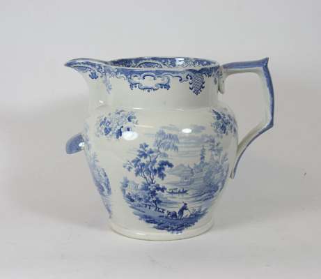 A large early 19th century blue printed jug by Goodwin Bridgwood & Co.