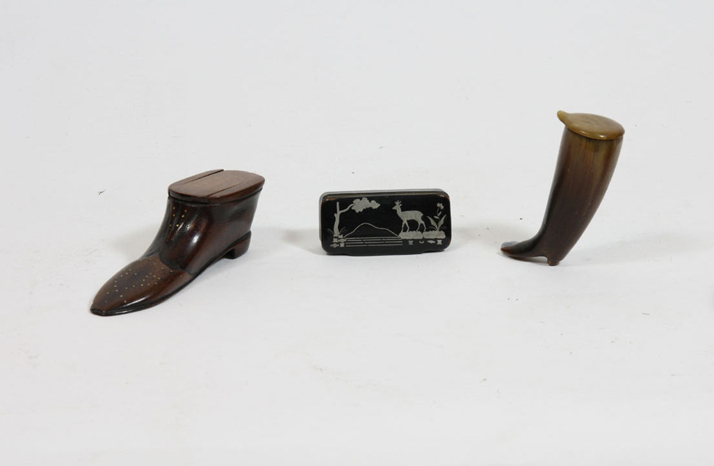 a papier mache box with abstract polychrome design; a straw work etui with ivory tools; a shoe shaped horn snuff mull; a lacquer box with inlaid metal deer design; and a papier mache coaster with gilt band (6)