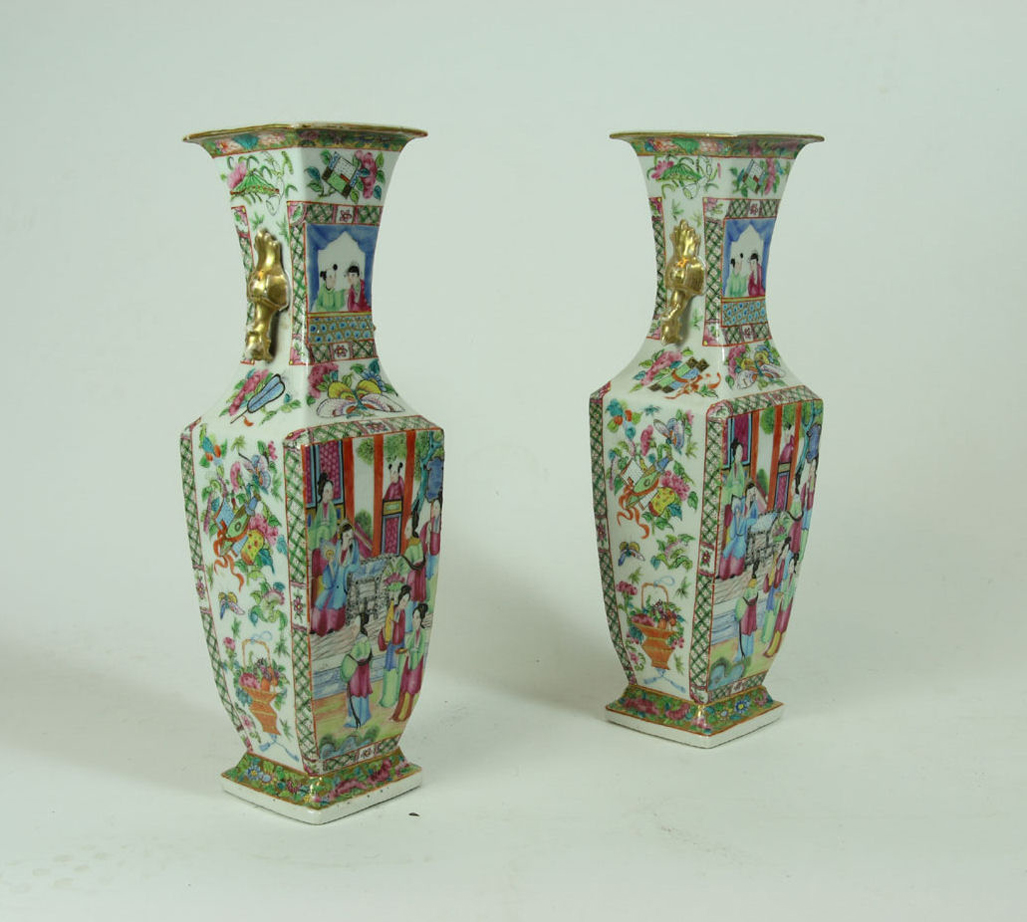 of square tapering section, with gilt handles, decorated with opposing panels of figures and antiquities (2)