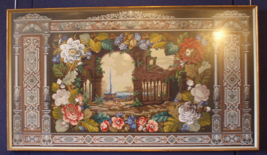 woven with an architectural scene with a fountain and deer to the centre, with inner floral surround and outer architectural border, framed and glazed