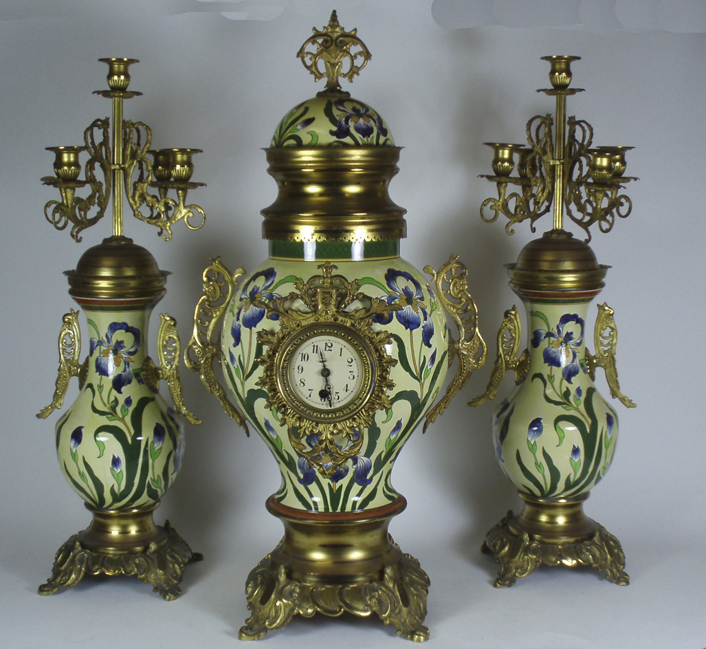 the dial with arabic numerals surrounded by gilt metal frame, the pottery body painted with purple irises on a light yellow ground, with two pierced gilt metal handles and similar finial (3)