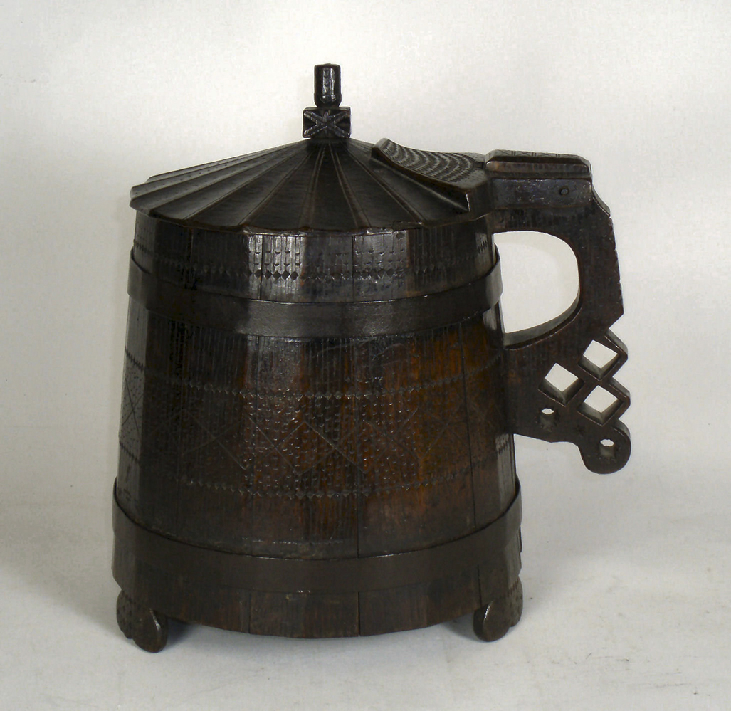 the fan shaped cover with pierced handle above a staved body with a frieze of abstract decoration, with three feet