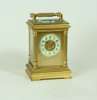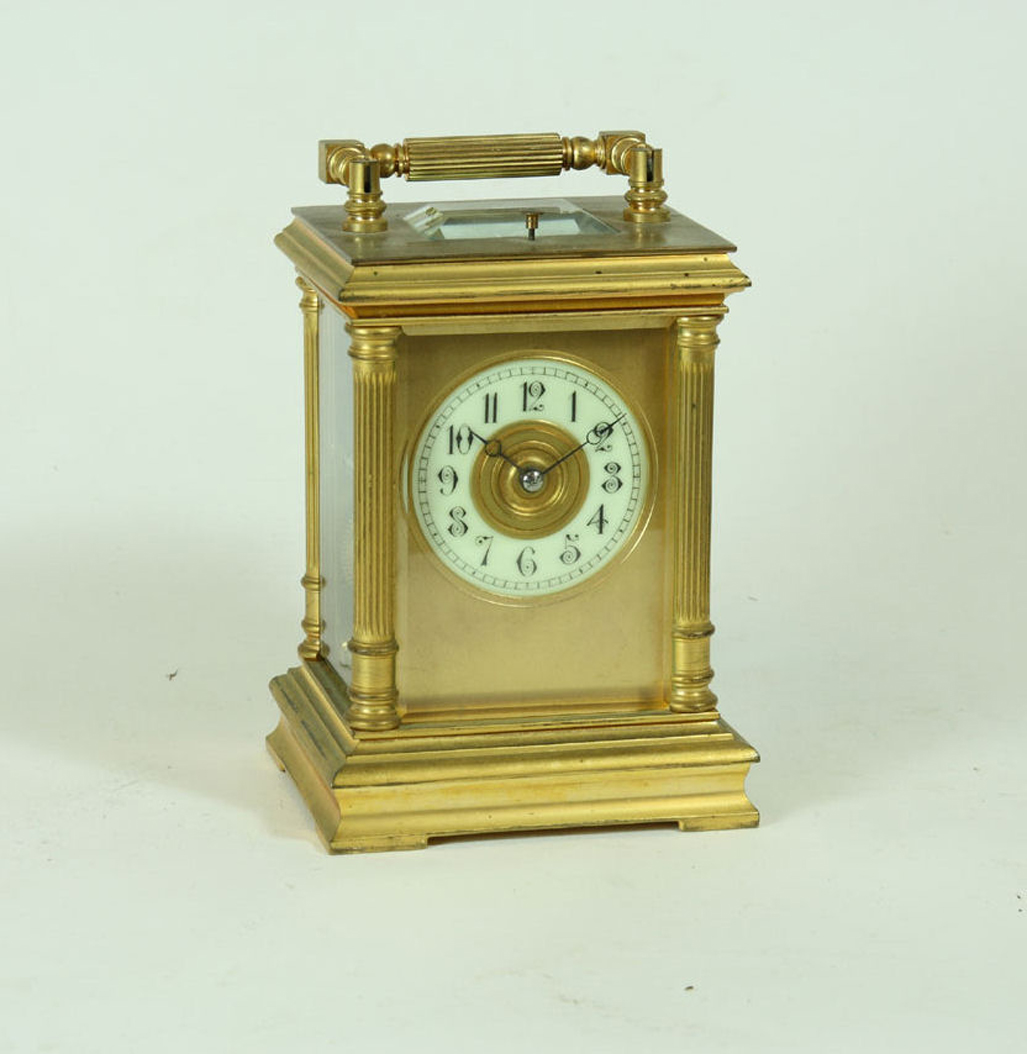 with handle to top, the architectural case flanked by columns on a stepped base, the cream coloured chapter ring with black arabic numerals, with push button repeater, striking on a coiled gong, 16cm high; and a pair of mid 19th century Derby style campana form vases, decorated with a bird and flowers on a gilt and cobalt blue ground, 10.5cm high (3)
