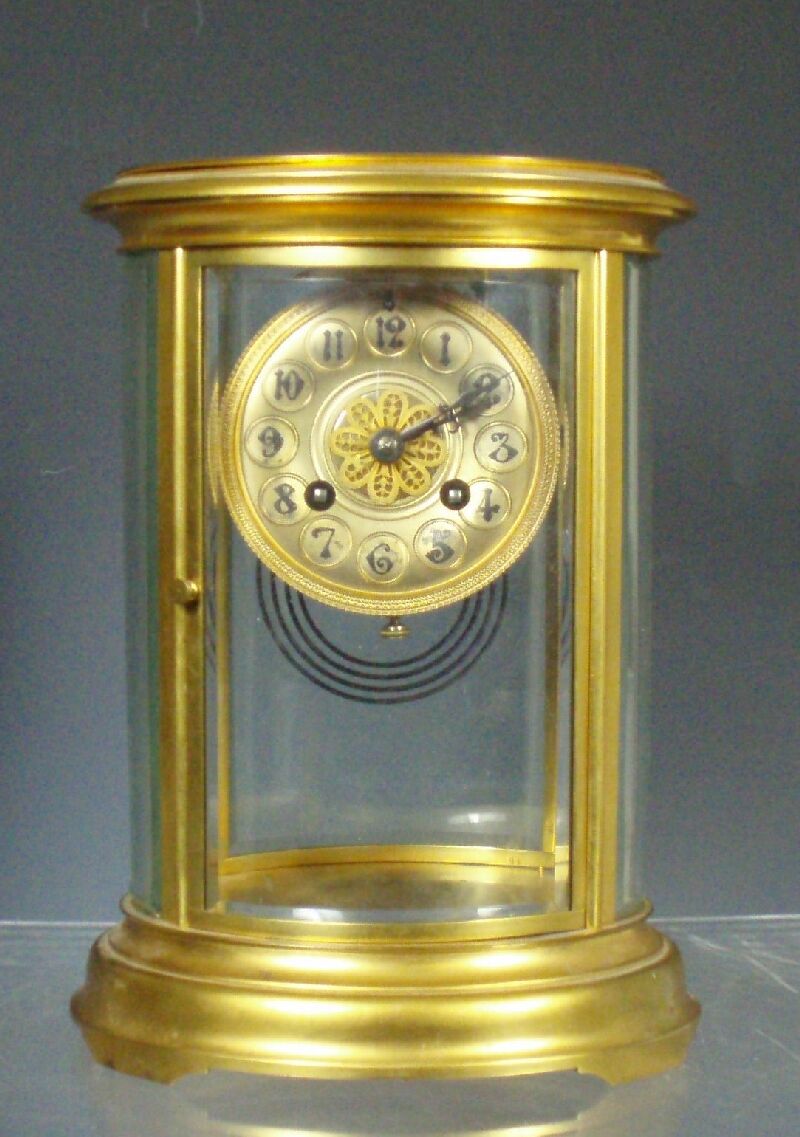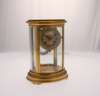 of oval form with enamelled and embossed arabic dial and mercury compensated pendulum, on plinth base