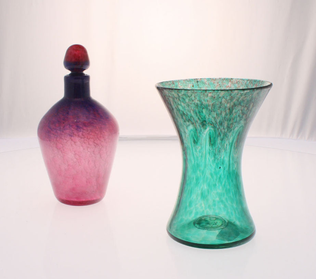 pink rising to blue, 21.5cm high; and a Strathern vase of waisted form green rising to aventurine, 18cm high (2)