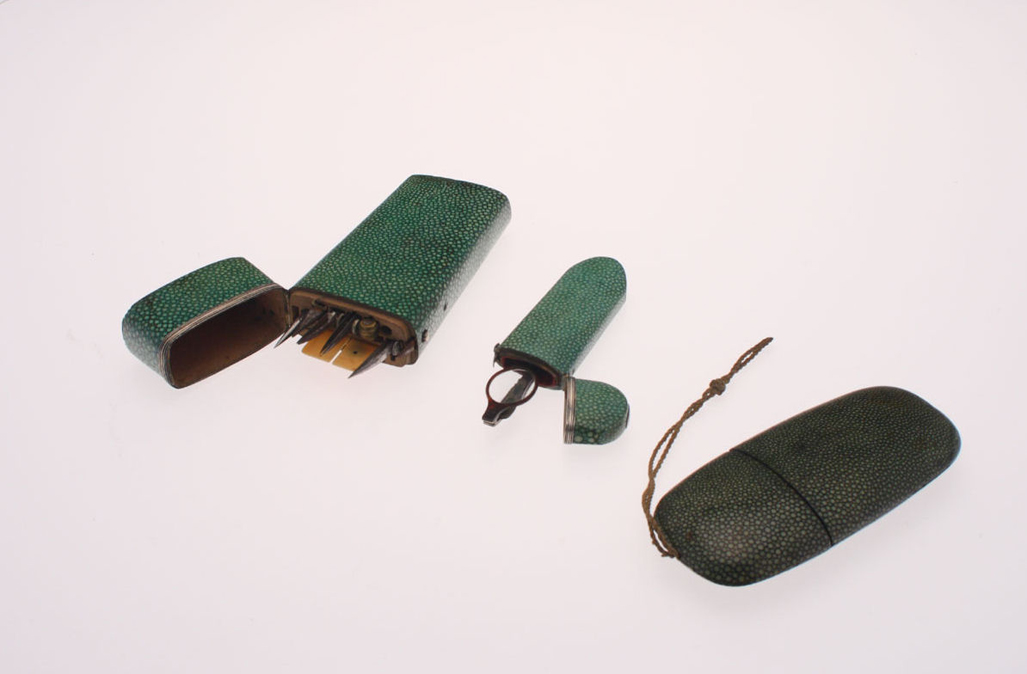 comprising: a green spectacle case, of oblong form with string support, 16cm long; a green etui, of tapered oblong form with tools inside, 17cm long; a green spectacle case, of oblong form, containing spectacles, 12.5cm long; and a pink bijouterie box, of rectangular form with ivory banding, 20cm wide (4)