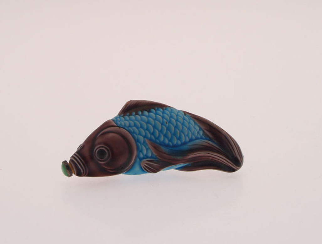 A Chinese turquoise and plum glazed carp form ceramic snuff bottle