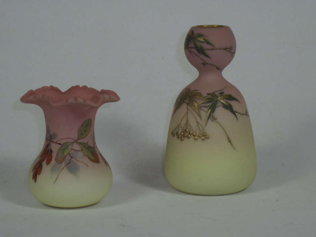 with frilled rim, decorated with flowers, 9cm high; and another Queens Burmese Art glass vase, of pink double gourd form, decorated with leaves and fruit, 13cm high, each with etched mark to base (2)