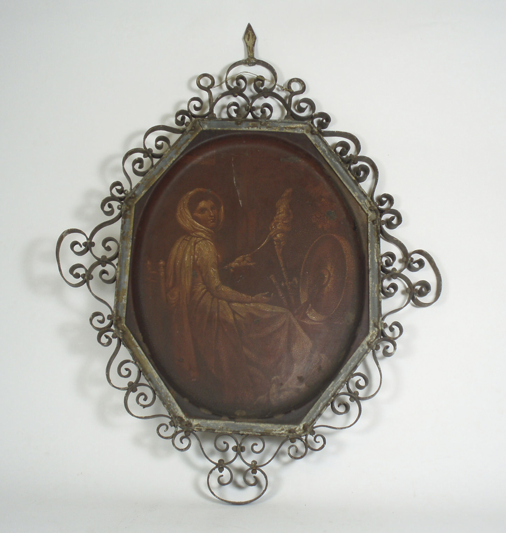 of octagonal form with cast iron scroll work border, the centre decorated with a woman spinning, the verso with inscription 'The Sign of the Spinning Wheel'