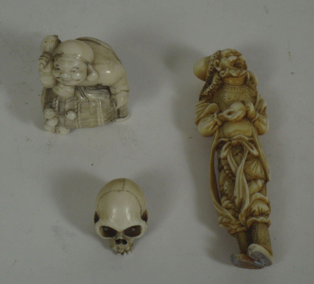 modelled as a grotesque with octopus on his head, 9cm high; a part skull netsuke; and a man on a barrel netsuke (3)