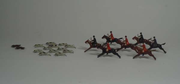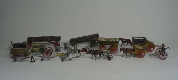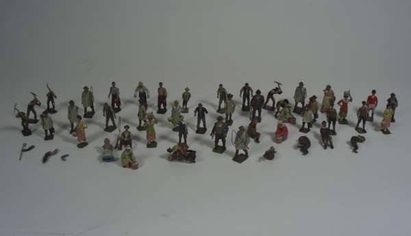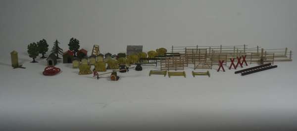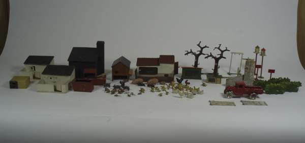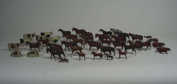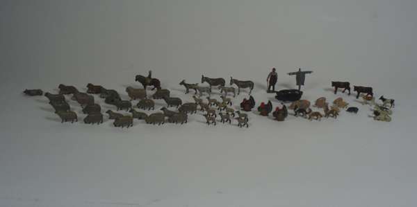 all of painted lead or tin, many by Britains, including a large collection of cows, horses, some with riders, sheep, dogs and farmyard workers; a collection of landscape items and farmyard buildings (qty)