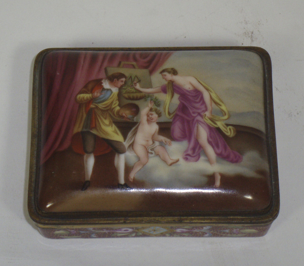 the lid and interior with well painted figure panels, 7.5cm high; a ruby perfume flask and three others (5)