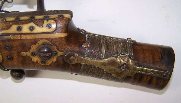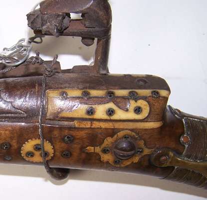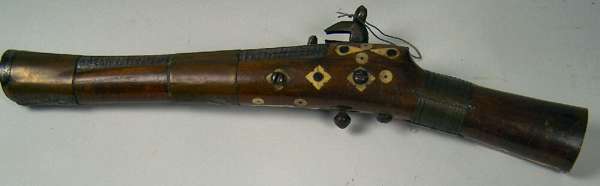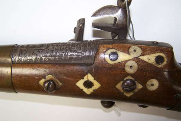 the barrel with flared muzzle, the walnut stock inlaid with camel bone decoration, ball trigger (no trigger guard), 40.5cm long; and another similar with missing butt cap (2)