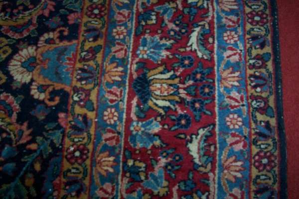 the indigo field with allover cypress tree and floral vine pattern, within red palmette and floral vine border between blue and camel bands