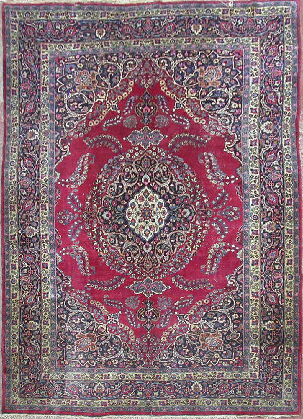 the claret field with central indigo and ivory medallion suspending pendants, indigo spandrels, within indigo palmette and foliate vine border between lemon and blue bands