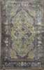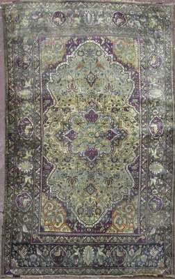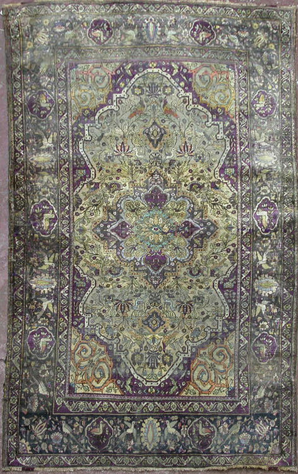 the cream field with central grey, purple and blue medallion suspending pendants, purple and cream spandrels, within grey bird, palmette and foliate vine border between purple bands (worn)