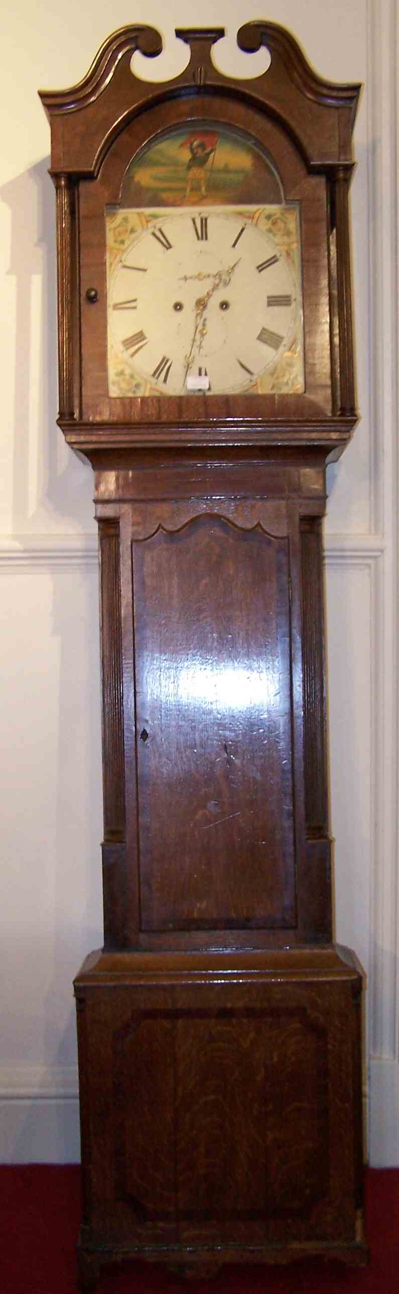 the figural and foliate painted arched dial with subsidiary second and date dials, the eight-day movement with anchor escapement, striking on a bell, the hood with a broken swan neck pediment and twin reeded pilasters, the rectangular case with reeded quarter columns and raised on bracket feet