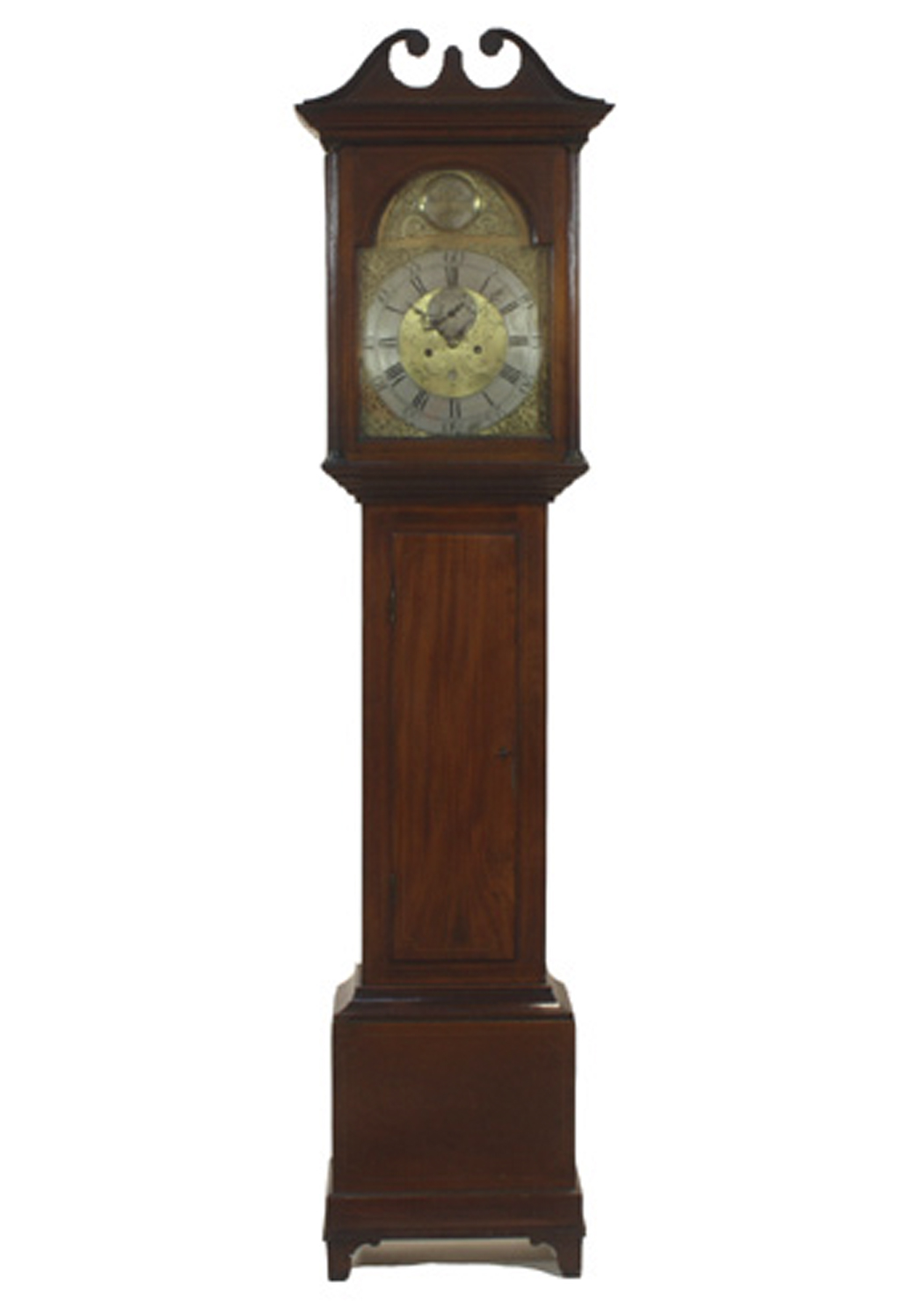 with twin train movement, the swan neck pediment over arched face, with arabic and roman chapters, subsidiary seconds dial and date aperture, surrounded by brass spandrels and sea creatures, moulded trunk door, plinth base raised on bracket feet