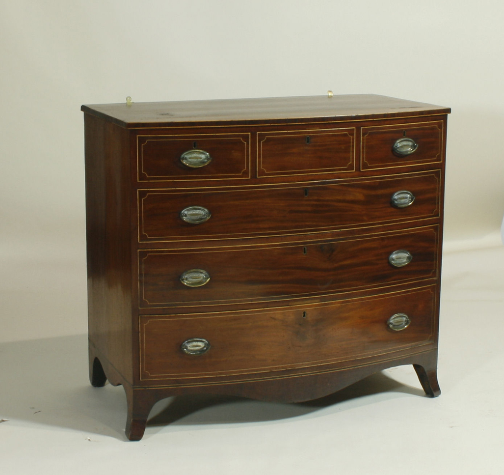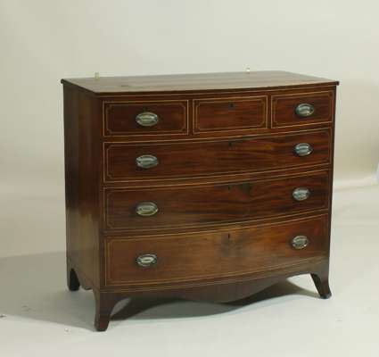 with three short drawers over three graduated long drawers with shaped apron and splayed bracket feet
