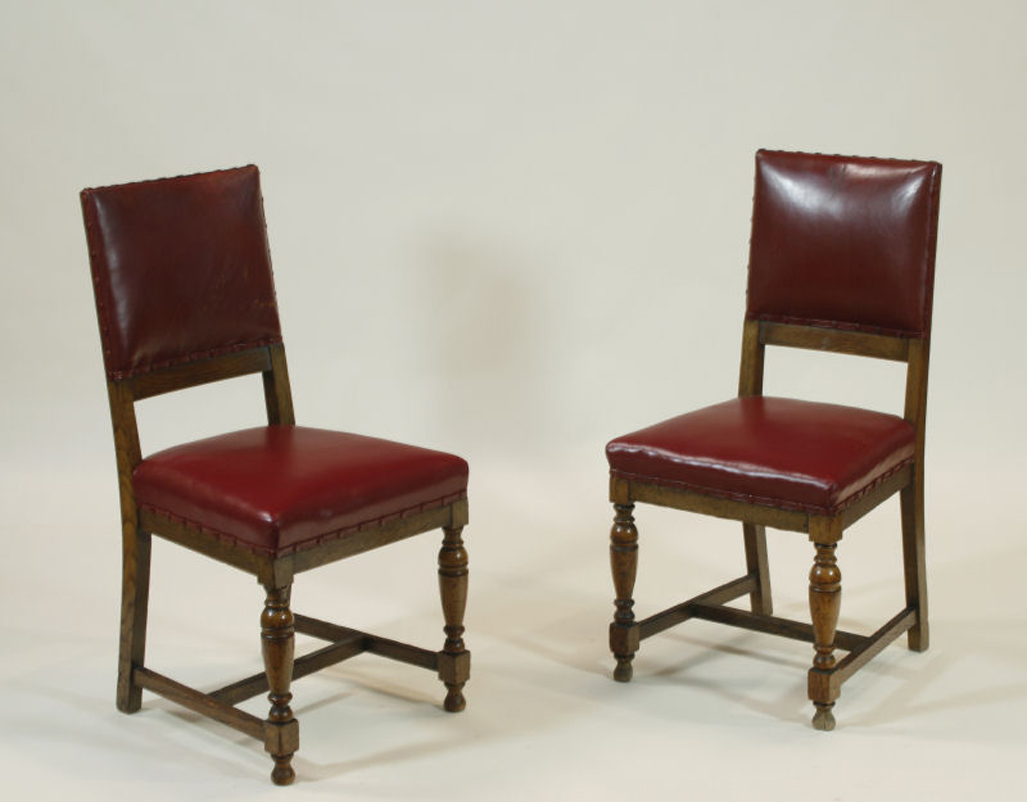 each with red leather cushioned back and seat, raised on baluster turned legs with flattened bun feet, united by stretchers (11)