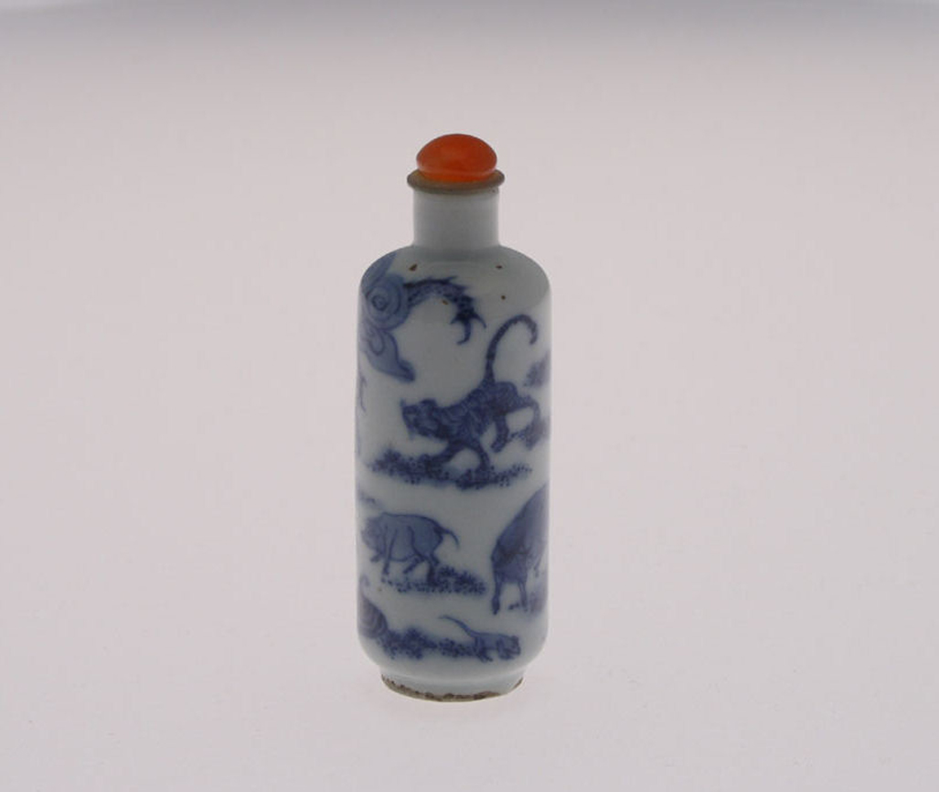 of cylindrical form, blue painted with animals including a tiger and cockerel, with agate stopper, 9cm high; and a 20th century Chinese ceramic snuff bottle of flattened pear form, blue painted with continuous figure decoration, printed character mark, 8.5cm high (2)