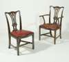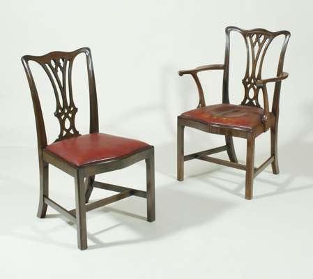 each with serpentine top-rail over interlaced vertical splat drop-in, serpentine leather pad seat and square legs united by stretchers; including a carver (18)