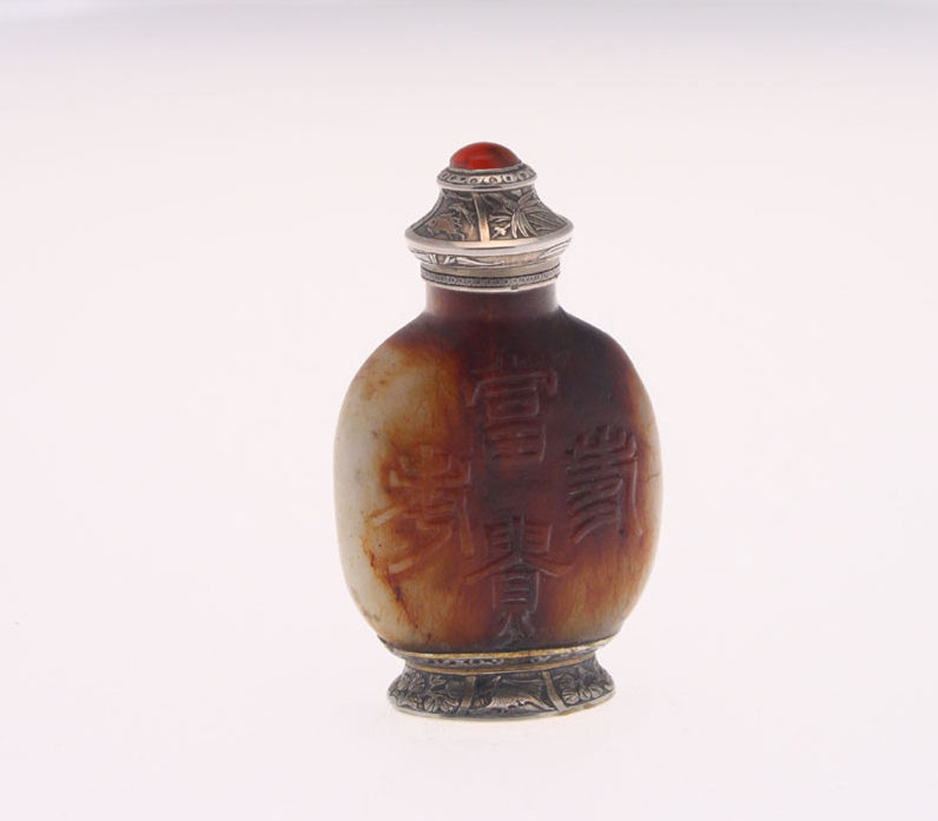 of flattened oval form, relief carved with characters with incised white metal stopper and mounts