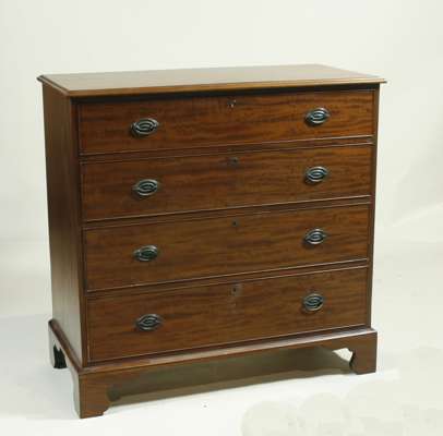 the moulded rectangular top over four graduated cock-beaded long drawers, raised on shaped bracket feet
