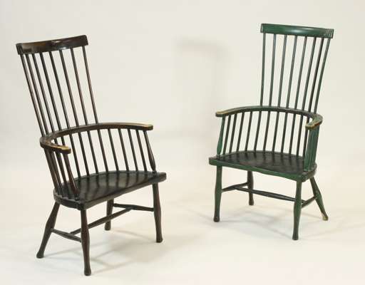 the plain top-rail over arched open arms, the shaped seat raised on baluster turned legs, united by stretchers, (2)