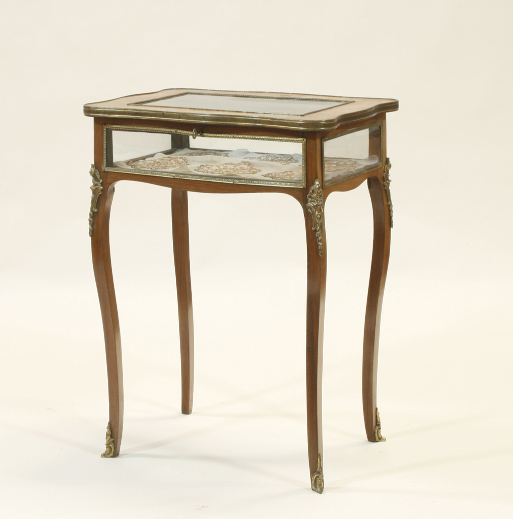 the brass bound serpentine top with glass panels above cabriole legs with ormolu floral mountings and sabots